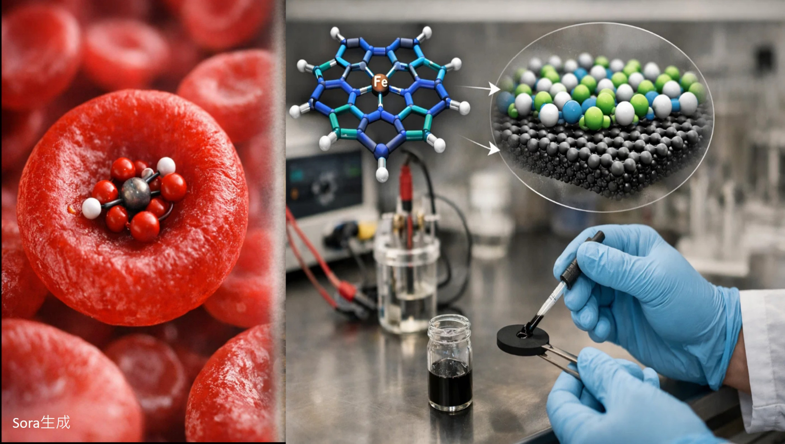 自然界其實早就有一套「不用稀有金屬、卻能高效處理氧氣」的做法,那就是人體紅血球中的血紅素。血紅素的 heme 結構以鐵原子為核心,能讓氧分子(O₂)被「暫時抓住、再適時放開」,支撐身體內部一連串氧化還原反應的能量利用。