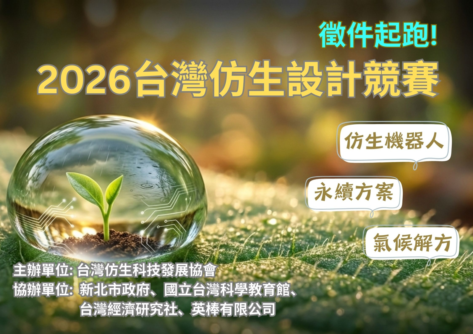 一、【大專暨青創組】主題為「符合聯合國永續發展目標(SDGs)的仿生創新方案」,由仿生協會主辦,新北市政府、台經社永續發展政策研究中心協辦;收件至2026年6月30日(二)23:59截止。