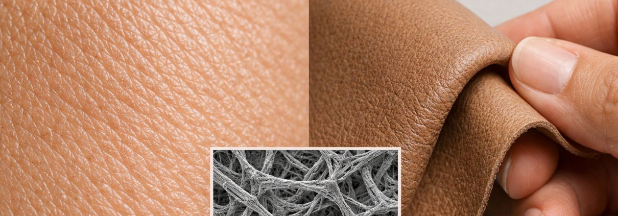 自然界中,皮膚(skin)提供了一種高度成熟的結構解法。皮膚並非單一材料,而是一種由膠原蛋白(collagen)與彈性蛋白(elastin)交織而成的層級纖維網絡。這種結構同時具備強度、柔韌性與可恢復性,使其能在外力作用下保持穩定並迅速回復形狀。關鍵在於其「階層式組織」(hierarchical structure),從分子到纖維再到組織層級,逐步形成兼具性能與適應性的材料系統。
