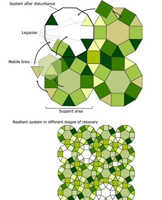 森林和其他生態系統可以藉由生物傳承性、流動連結物種和支持區域復原至干擾前的組成和結構。