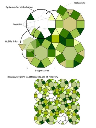 Forests and other ecosystems can return to their predisturbance composition and structure through the presence of biological legacies, mobile links, and support areas.