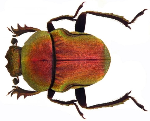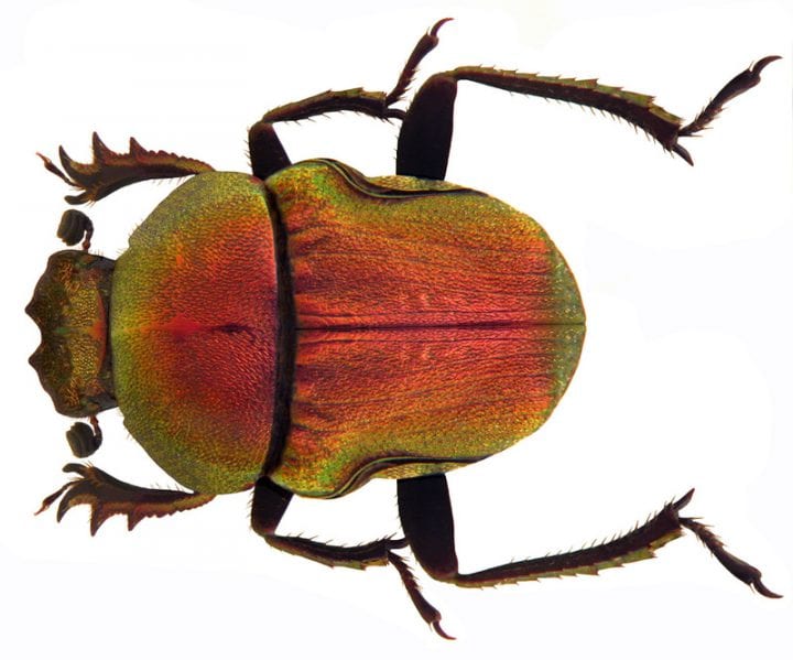 甲蟲的背甲因為其超薄層以螺旋斜紋方向排列,而呈現多重色彩 (Carapace of beetle appears multihued because of ultrathin layers in a corkscrew orientation.)
