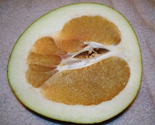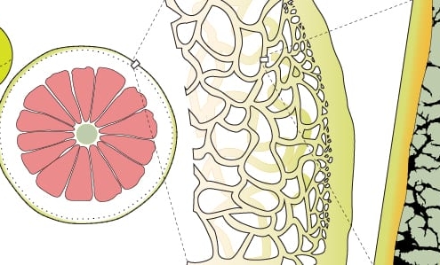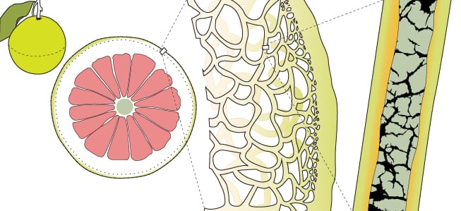 柚子果實由於其複合果皮的層次組織而有絕佳的減震特性 (The pomelo fruit has excellent damping properties due to the hierarchical organization of its composite peel)