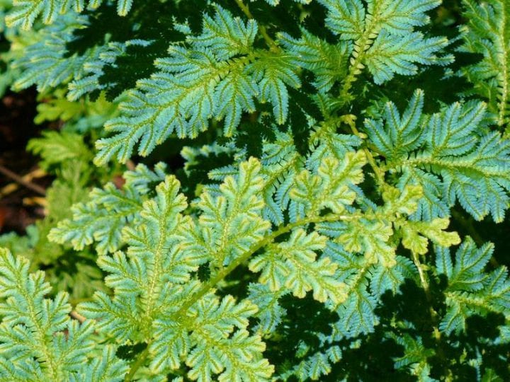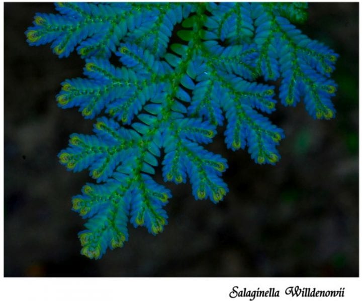 (Leaves of extreme shade Selaginella tropical ferns change in improving light conditions from being iridescent blue to green by removal of photoprotective coating.)